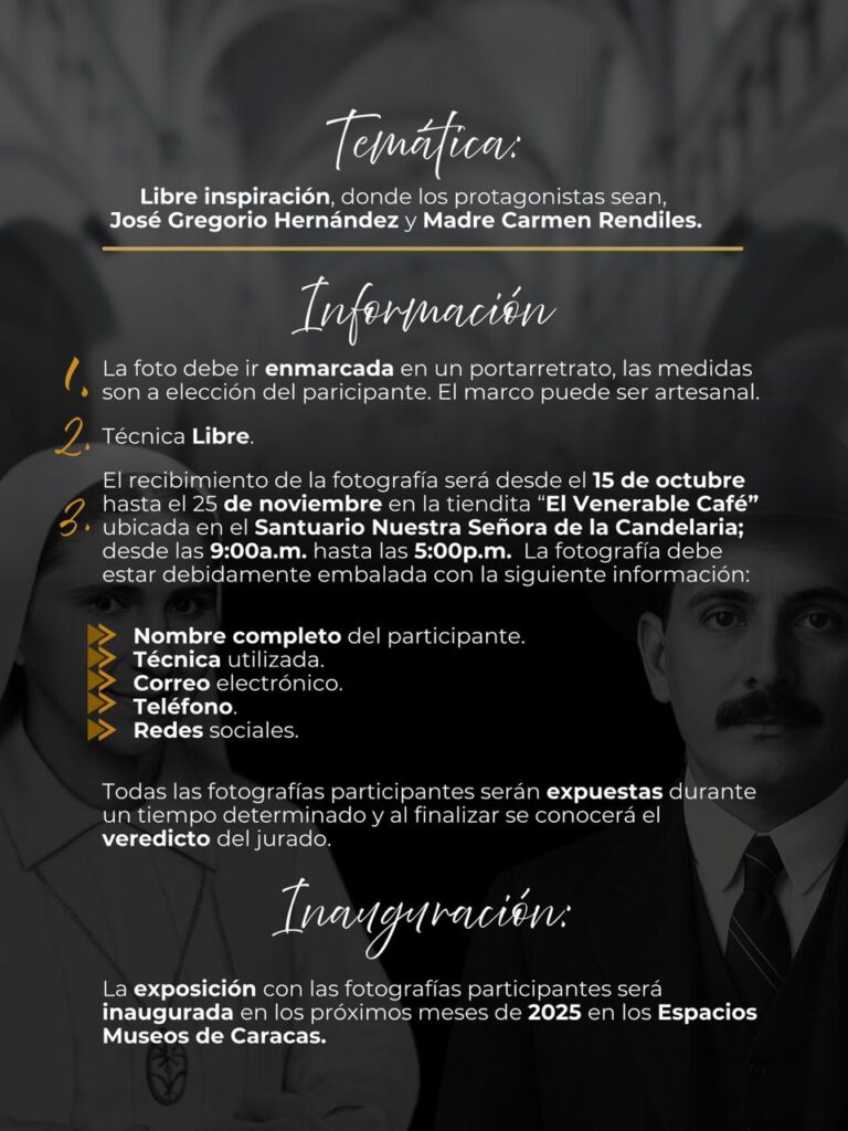 El Santuario Nuestra Señora de La Candelaria y la Fundación Museos de Caracas invitan a fotógrafos aficionados y profesionales a participar en el Concurso de Fotografía “San José Gregorio Hernández y Santa María Carmen Rendiles siempre cerca de todos”, una iniciativa cultural para honrar la vida y el legado de los dos primeros santos venezolanos, el “Médico de los Pobres” y la Fundadora de la Congregación Siervas de Jesús. Una oportunidad para capturar, a través del lente, la fe, la devoción y la cercanía de estos insignes venezolanos.