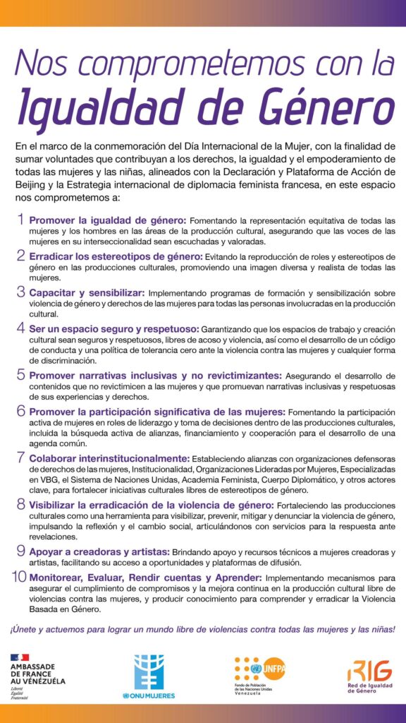 En el marco de los 16 días de activismo contra la violencia de género y del compromiso con la diplomacia feminista, la Embajada de Francia en Venezuela junto a las organizaciones ONU Mujeres, UNFPA y la Red de Igualdad de Género consolidan compromisos por la Agenda de Mujeres en el ámbito cultural.