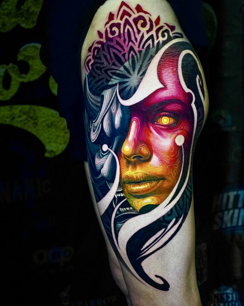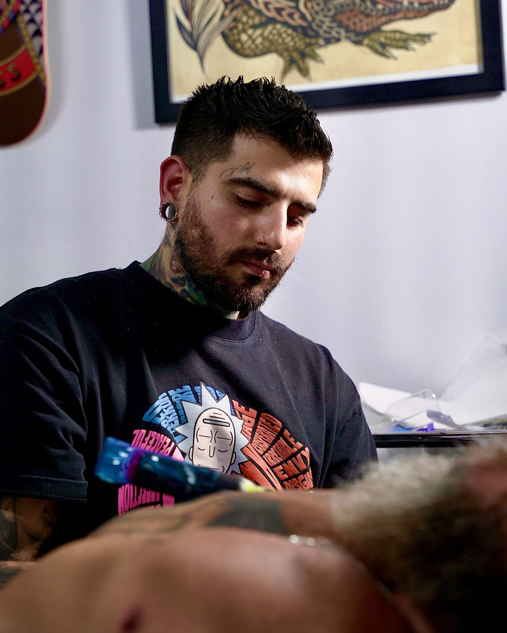 “Antes de dedicarme al tatuaje, estaba muy enfocado en el graffiti. Uno de mis compañeros de ese entorno, Adrián Sangronis, comenzó a tatuar y fue quien me hizo mi primer tatuaje: los nombres de mis padres. Esa experiencia me despertó una gran curiosidad por el arte en la piel. En ese momento trabajaba en una zapatería, y con mucho esfuerzo logré reunir dinero para comprar mi primer kit de tatuaje por internet. Recuerdo que cuando llegaron las máquinas, tatué a un amigo en la sala de mi casa, unas letras en las costillas. Tenía 18 años. Desde ese momento supe que eso era lo que quería hacer, y nunca más dejé de tatuar. Con el tiempo, ese hobby que empezó como curiosidad se convirtió en mi profesión, y eventualmente en lo que me llevaría a emigrar, reinventarme en otro país y construir la carrera que tengo hoy.” Recalcó Gil, quien pese a estudiar Economía en la Universidad Central de Venezuela, ha pasado los últimos años formándose en el área artística, con cursos enfocados en distintas técnicas como acuarela, óleo, acrílico y dibujo con grafito; y el seminario con el artista Jonathan Morales, en Caracas, con quien exploró técnicas específicas que elevaron su nivel y su forma de ver el tatuaje como un arte más estructurado y profesional.